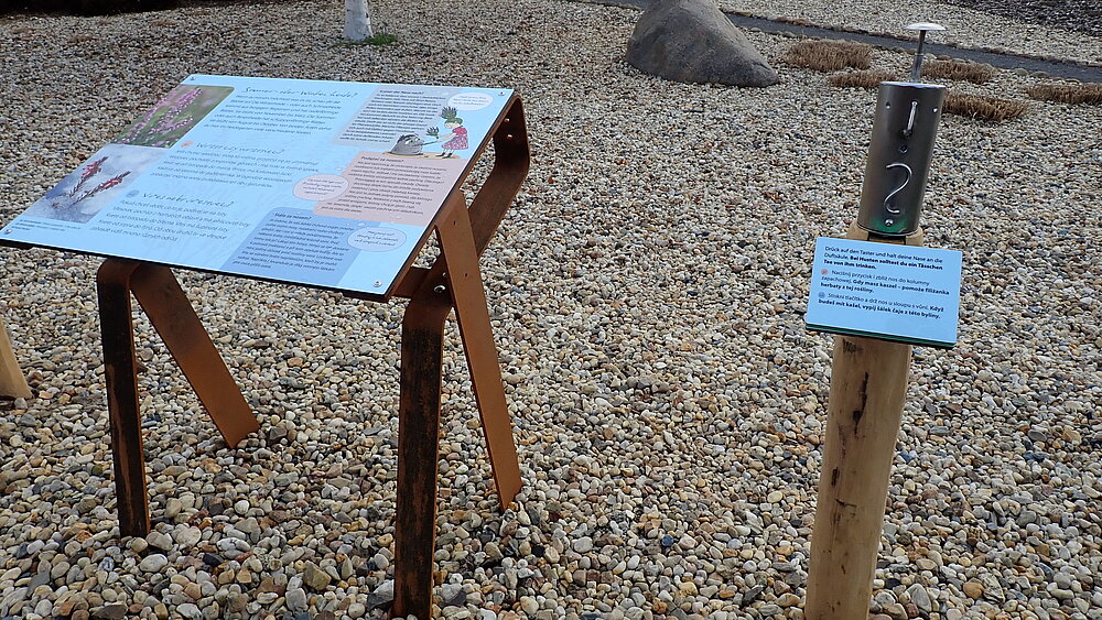 2 of the 6 stations are designed with adventure elements: A audio station about meadow birds and a mountain meadow quiz invite visistors to test their knowledge in a fun way. The theme focuses on the typical mountain meadows, mat-grass grassland and rare meadow breeders around the Wasserkuppe.